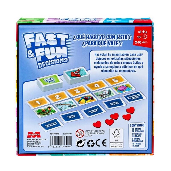 ¡Haz volar tu imaginación! En Fast & Fun, te verás envuelto en situaciones extrañas donde tendrás que usar objetos cotidianos de formas poco convencionales. Tu misión es ordenar esos objetos de mayor a menor utilidad según la situación secreta en la que te encuentres. El resto de tu equipo deberá leer tu mente (y tu orden de prioridades) para adivinar qué te está ocurriendo.