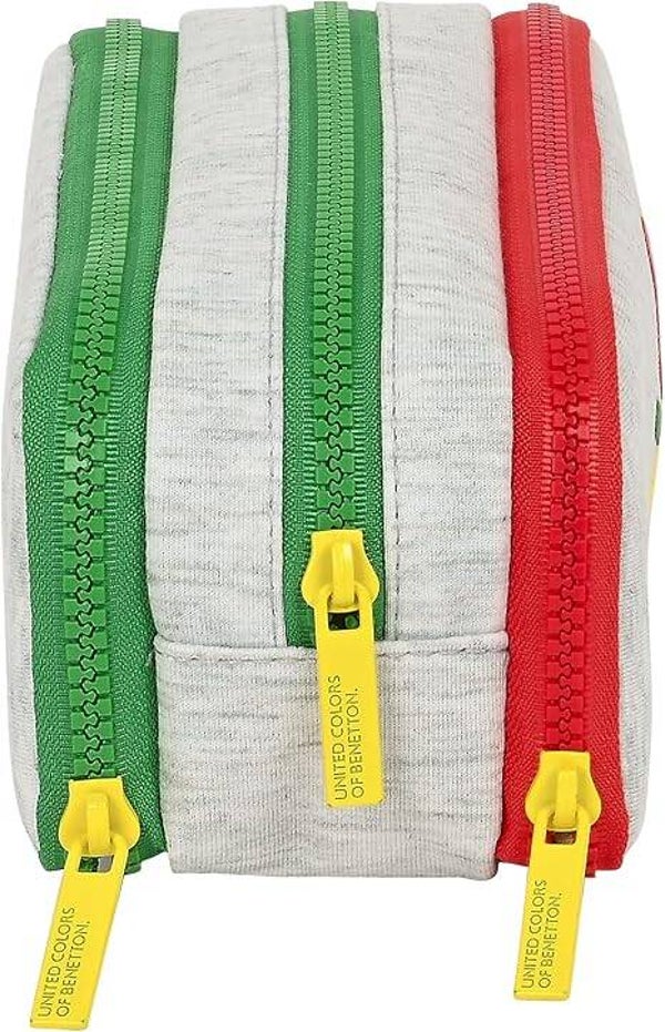 Bonito estuche de la marca Benetton recomendada para uso escolar. Tiene 3 compartimentos separados con cremallera, y un bolsillo interior central que también cierra con una cremallera. Sus medidas son 220x30x120 mm, y su capacidad es de 0,6 L.
