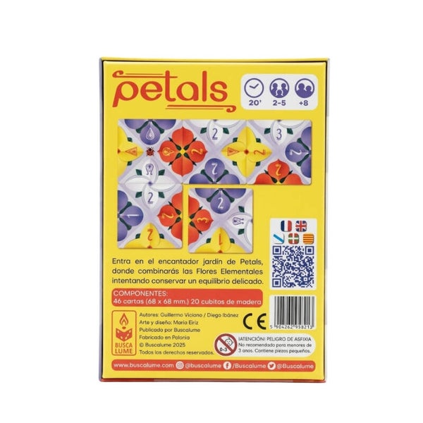 Petals es un precioso juego de cartas donde la editorial Buscalume busca adentrarnos en la armonía de la naturaleza, a la vez que vamos desarrollando una divertida estrategia para lograr optimizar el jardín, y conseguir el equilibrio. En este bonito jardín de flores elementales, los jugadores deben conectar pétalos iguales para avanzar en sus marcadores, pero con un giro crucial: el equilibrio entre los elementos determinará quién se alza con la victoria.